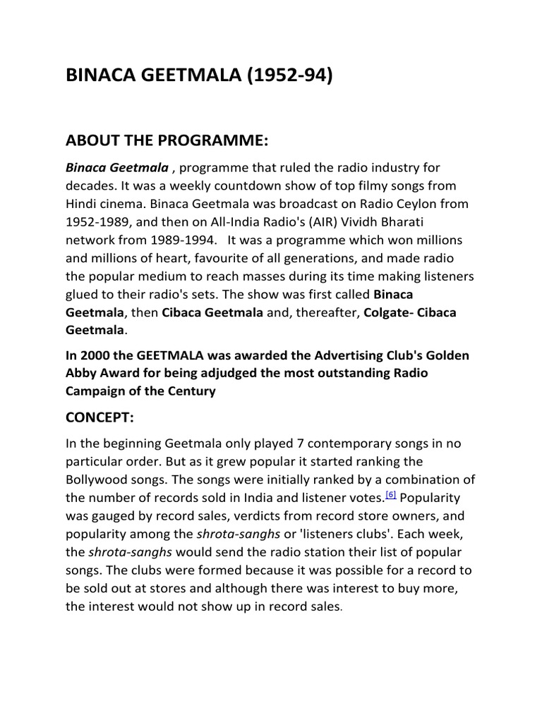 Binaca Geetmala 1972 / Binaca geetmala was a weekly countdown show of top filmi songs from hindi cinema. Binaca Geetmala 1972 : Binaca geetmala was a weekly countdown show of top filmi songs from hindi cinema.